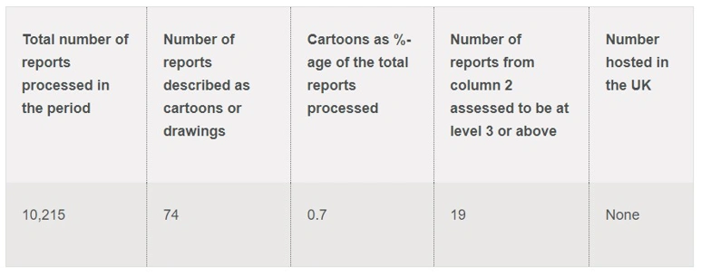 1. Under the present legislation none of the 74 reports shown in column 2 above were potentially illegal. The reporting page on the IWF web site refers to images so many would be reporters may be aware that cartoon depictions of child abuse are not potentially illegal under present UK law.